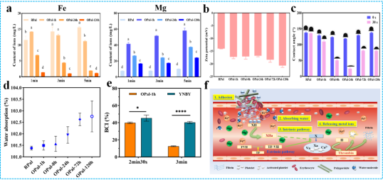 研究表明,隨著草酸溶蝕時(shí)間的延長(zhǎng),凹凸棒石骨架中可釋放的Fe3+和Mg2+離子顯著減少,表面電荷更負(fù),接觸角顯著下降后略有增加。溶蝕1h時(shí)較好地保留了止血過程所需的3價(jià)鐵離子和2價(jià)鎂離子,有利于加速凝血反應(yīng)。