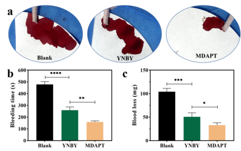 基于各種黏土礦物屬性的差異,團(tuán)隊(duì)選擇混維凹凸棒石黏土、蒙脫石、高嶺石、埃洛石和沸石開展了止血性能的對(duì)比研究。選擇全血?jiǎng)討B(tài)血紅蛋白吸光度、凝血指數(shù)、血漿動(dòng)力學(xué)、紅細(xì)胞和血小板黏附和激活以及小鼠斷尾止血模型等指標(biāo)系統(tǒng)研究材料的止血性能和止血機(jī)理。研究發(fā)現(xiàn),混維凹凸棒石黏土確實(shí)具有最佳止血性能。