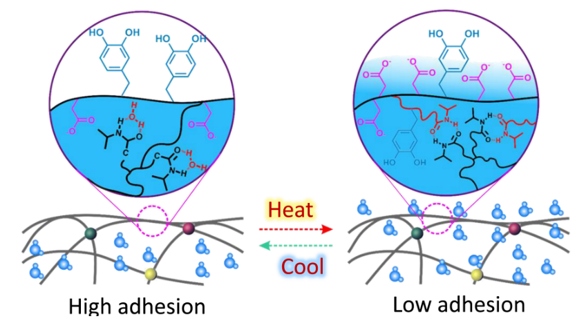 這項突破并非一蹴而就。周峰回憶,幾年前,團隊一直攻關高強韌黏附水凝膠材料,偶然發(fā)現(xiàn)一種材料在多次按壓后黏性驟降?!霸摤F(xiàn)象引發(fā)了我們的極大興趣,經(jīng)過對材料的成分分析、機理驗證等,才知道原來在多次按壓以后,手部溫度傳遞到凝膠表面,致使凝膠發(fā)生相變,呈現(xiàn)低黏附態(tài)?!边@讓團隊意識到,溫度可能是調控黏附性能的鑰匙。
