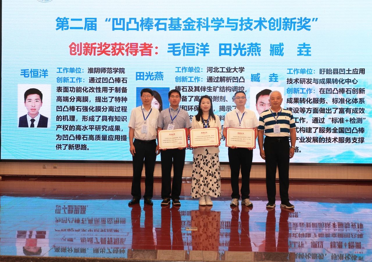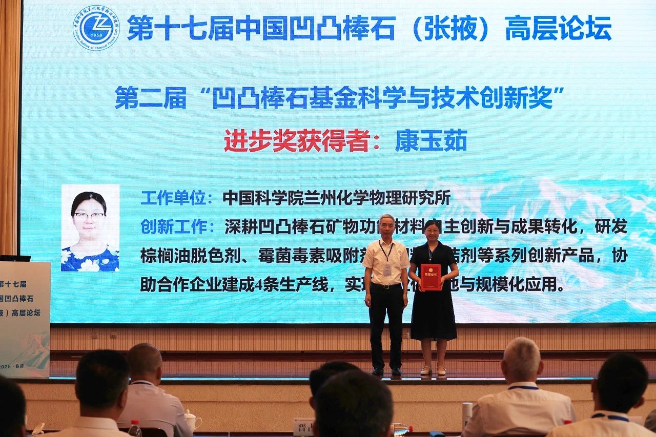 開幕式上,頒發(fā)了第二屆凹凸棒石基金科學(xué)與技術(shù)創(chuàng)新獎(jiǎng),以激勵(lì)更多優(yōu)秀人才加入凹凸棒石研究隊(duì)伍。蘭州化物所康玉茹高級(jí)工程師榮獲進(jìn)步獎(jiǎng),河北工業(yè)大學(xué)田光燕副教授、淮陰師范學(xué)院毛恒洋副教授和盱眙縣凹土應(yīng)用技術(shù)研發(fā)與成果轉(zhuǎn)化中心臧垚工程師獲得創(chuàng)新獎(jiǎng)。