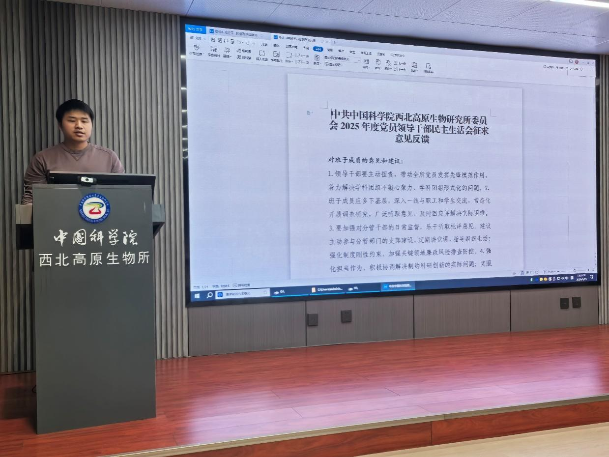 組織委員兼紀(jì)檢委員張昆領(lǐng)學(xué)了習(xí)近平在中共中央政治局第二十四次集體學(xué)習(xí)會(huì)議精神,通報(bào)了《中共中國科學(xué)院西北高原生物研究所委員會(huì)2025年度黨員領(lǐng)導(dǎo)干部民主生活會(huì)征求意見反饋》。