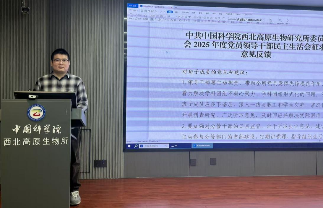 組織委員劉博向全體參會人員通報《中共中國科學(xué)院西北高原生物研究所委員會2025年度黨員領(lǐng)導(dǎo)干部民主生活會征求意見反饋》的情況。預(yù)備黨員唐有林,發(fā)展對象盧露、孟頤新、李霞、李子雁,入黨積極分子吳玥、宋枚汐依次匯報了本季度思想動態(tài)、學(xué)習(xí)進展及工作成效。