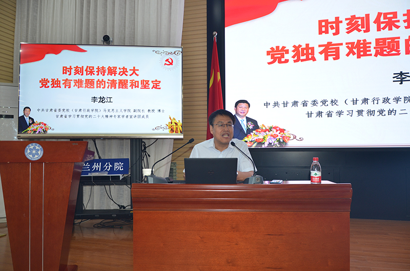 會議邀請了甘肅省委黨校馬克思主義學(xué)院副院長李龍江教授作《時刻保持解決大黨獨(dú)有難題的清醒和堅定》專題輔導(dǎo)報告。報告圍繞“把握大黨獨(dú)有難題的原因和表現(xiàn)”“明確提出大黨獨(dú)有難題的重大意義”“總結(jié)解決大黨獨(dú)有難題的歷史經(jīng)驗(yàn)”“以自我革命精神破解大黨獨(dú)有難題”四個方面進(jìn)行了全面細(xì)致的講解,從新時代新征程黨和國家事業(yè)發(fā)展全局的高度,分析大黨獨(dú)有難題的形成原因、主要表現(xiàn)和破解之道。報告高屋建瓴、內(nèi)涵豐富,思路清晰、分析透徹,既有深邃系統(tǒng)的理論闡釋,又有大量鮮活的實(shí)踐案例,對認(rèn)真貫徹落實(shí)習(xí)近平新時代中國特色社會主義思想具有很強(qiáng)的指導(dǎo)意義。