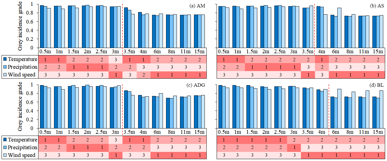 圖2 多年凍土溫度與氣候因子的灰色關(guān)聯(lián)度(直方圖)和三種氣候因子對(duì)多年凍土變化影響的相對(duì)重要性排序(表)