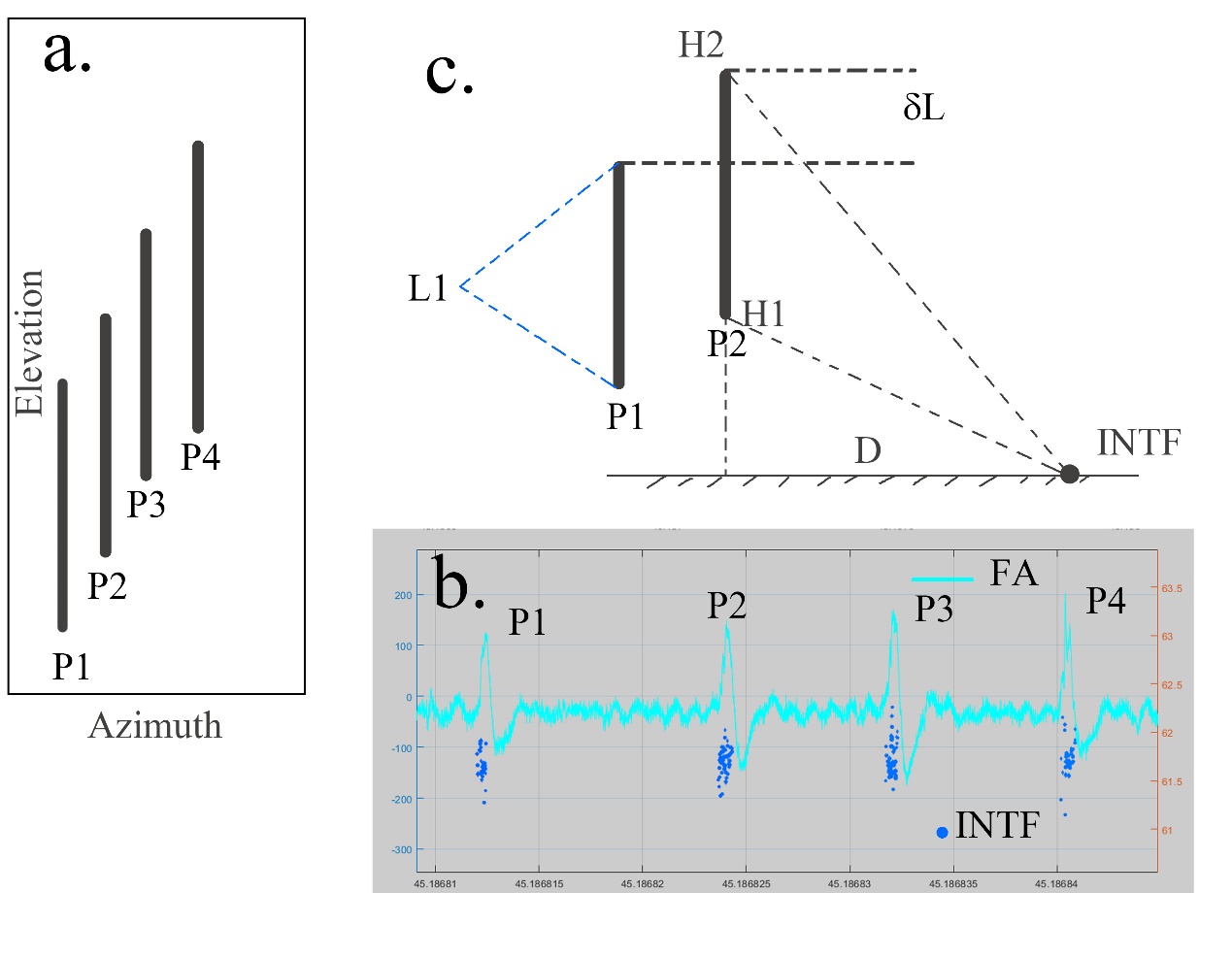圖2. VHF干涉儀(Fan et al.,2023a;2023b)對(duì)規(guī)則脈沖爆發(fā)序列中連續(xù)脈沖的二維觀測(cè)結(jié)果,顯示這些脈沖比正常的直竄先導(dǎo)速度更快,并且從一個(gè)脈沖到另一個(gè)脈沖之間重疊較強(qiáng)?。╝)。從平面距離 D?。健?.8 公里和干涉儀仰角的差異(例如,60.5° 和 60°),可以得出脈沖的 VHF輻射源的垂直范圍約為 205 米?。╟)。這一現(xiàn)象發(fā)生在約 2 微秒的時(shí)間間隔內(nèi),對(duì)應(yīng)的速度約為 108 米/秒。脈沖代表的擊穿速度遠(yuǎn)高于已知的閃電先導(dǎo)通道發(fā)展速度。