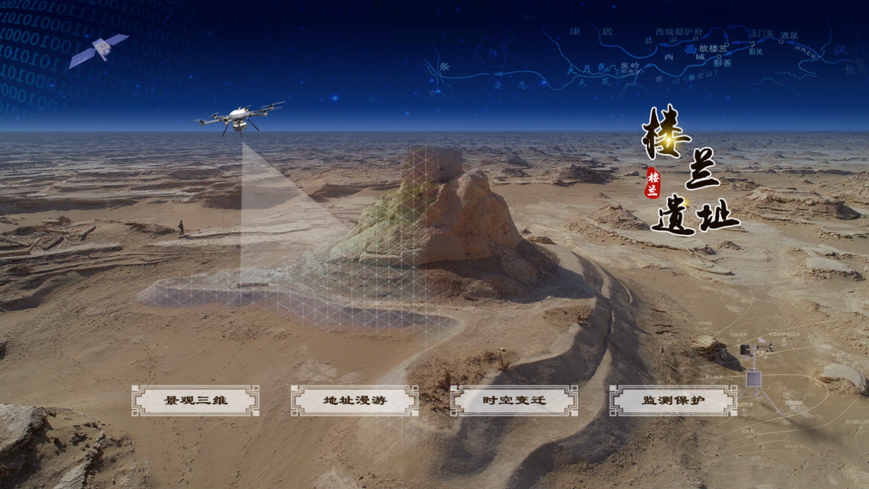 系統(tǒng)平臺通過“景觀三維、遺址漫游、時空變遷、監(jiān)測保護”四個功能模塊,實現(xiàn)了衛(wèi)星宏觀遙感、無人機精細測繪、地面實時監(jiān)測等綜合技術在樓蘭遺址的協(xié)同應用。能夠通過精細二三維實景地圖模型客觀真實、身臨其境地展示遠在千里之外的神秘古城;通過歷史地圖和衛(wèi)星遙感數(shù)據(jù)的空間一體化,提供了一套研究樓蘭古跡時空演變的空間數(shù)據(jù)庫;利用衛(wèi)星、無人機和地面?zhèn)鞲衅骷夹g,實現(xiàn)了“天空地”一體化的樓蘭遺址生態(tài)環(huán)境因子系統(tǒng)監(jiān)測與分析。