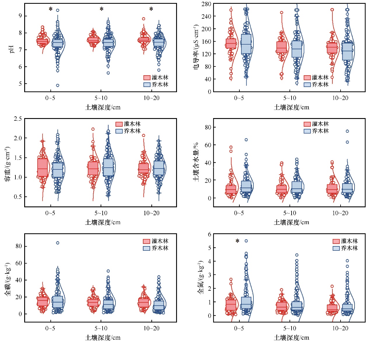 研究結果表明,農(nóng)牧交錯帶人工林土壤整體呈弱堿性,電導率153.55±3.02 μS·cm-1、土壤容重0.53~2.28 g·cm-3、土壤含水量12.54%±0.62%,土壤全碳和全氮含量分別為13.74±0.61 g·kg-1和0.88±0.05 g·kg-1。農(nóng)牧交錯帶人工林土壤自西向東酸性增強、容重下降、含水量增加、全碳含量下降、全氮含量增加。在氣候梯度上,人工林土壤pH值、電導率、容重與降水量顯著負相關,而土壤含水量、全碳和全氮含量與年降水量顯著正相關;人工林土壤全碳和全氮含量與年均氣溫和干燥度指數(shù)均顯著負相關。區(qū)域尺度上,喬木林土壤pH值顯著低于灌木林土壤,灌木林土壤全碳和全氮含量均高于喬木林(圖2)。