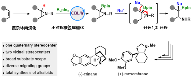 近日,該團(tuán)隊針對簡單烯烴不對稱多官能團(tuán)化存在的問題,利用其發(fā)展的CBL/銥催化體系,結(jié)合烯烴的氮雜環(huán)丙烷化/開環(huán)1,2-遷移硼化的組合策略,實(shí)現(xiàn)了簡單烯烴的不對稱三官能團(tuán)化反應(yīng),高對映選擇性地實(shí)現(xiàn)了鄰位季碳中心的手性胺。同時,利用該方法,團(tuán)隊首次實(shí)現(xiàn)了從廉價易得的環(huán)己烯到石蒜科生物堿(-)-crinane和(+)-mesembrane的對映選擇性全合成。