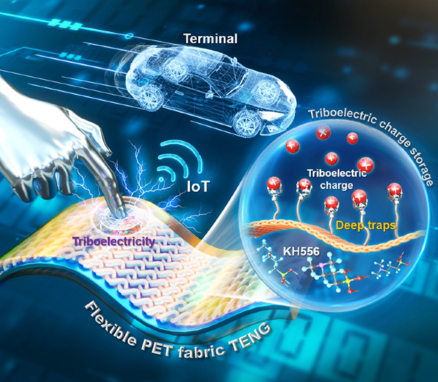 摩擦起電過程中產(chǎn)生的電荷會瞬時存儲在電介質(zhì)表面,進(jìn)而被兩種不同類型的陷阱(淺陷阱和深陷阱)捕獲。其中,淺陷阱中的電荷容易逸出,優(yōu)先耗散到環(huán)境中,而深陷阱中的電荷則因為極難逸出,可長期儲存。因此,影響摩擦層電荷耗散率的關(guān)鍵因素是陷阱捕獲電荷和被捕獲電荷的逃逸能力?;诖耍搱F(tuán)隊通過系統(tǒng)研究,揭示了載流子深陷阱在摩擦電荷存儲中的機(jī)制,通過分子自組裝技術(shù)在織物摩擦層界面構(gòu)建載流子深陷阱的方式增加TENG的電輸出,將該織物TENG用于物聯(lián)網(wǎng)可穿戴電子設(shè)備的電源模塊,實現(xiàn)了對機(jī)械運(yùn)動的穩(wěn)定控制。相關(guān)研究成果發(fā)表在Advanced Materials(2024,2303389)上。