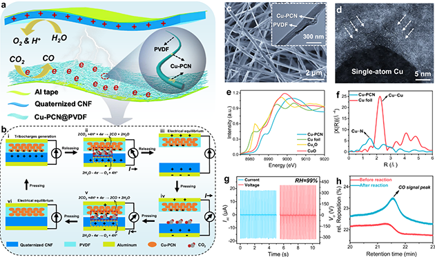 近日,研究團(tuán)隊與新加坡科學(xué)技術(shù)研究局的科研人員合作,在界面電荷利用方面做出新突破,利用單原子銅錨定的聚合物碳氮化物催化劑和季銨化纖維素納米纖維成功實現(xiàn)了接觸電催化CO2還原,生成CO的法拉第效率達(dá)到96.24?。?/span>。季銨化纖維素納米纖維由于含豐富的羥基,可在高濕度環(huán)境中與水分子形成氫鍵,固定水分子并參與接觸帶電并發(fā)生氧化反應(yīng),導(dǎo)致氧氣和質(zhì)子的產(chǎn)生,參與觸電催化CO2還原過程。這種方法在低濃度CO2環(huán)境中能高效地將其轉(zhuǎn)化為CO,為減少大氣CO2排放和推進(jìn)化學(xué)可持續(xù)性策略提供了一種解決方案。