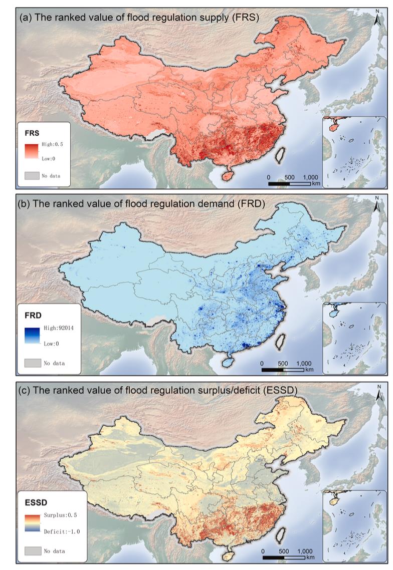 FRESF工具箱2號(hào)模塊的示例輸出,空間明確地繪制了我國(guó)2020年洪水調(diào)蓄生態(tài)系統(tǒng)服務(wù)的供給?。╝)、需求?。╞) 和赤字 (c)