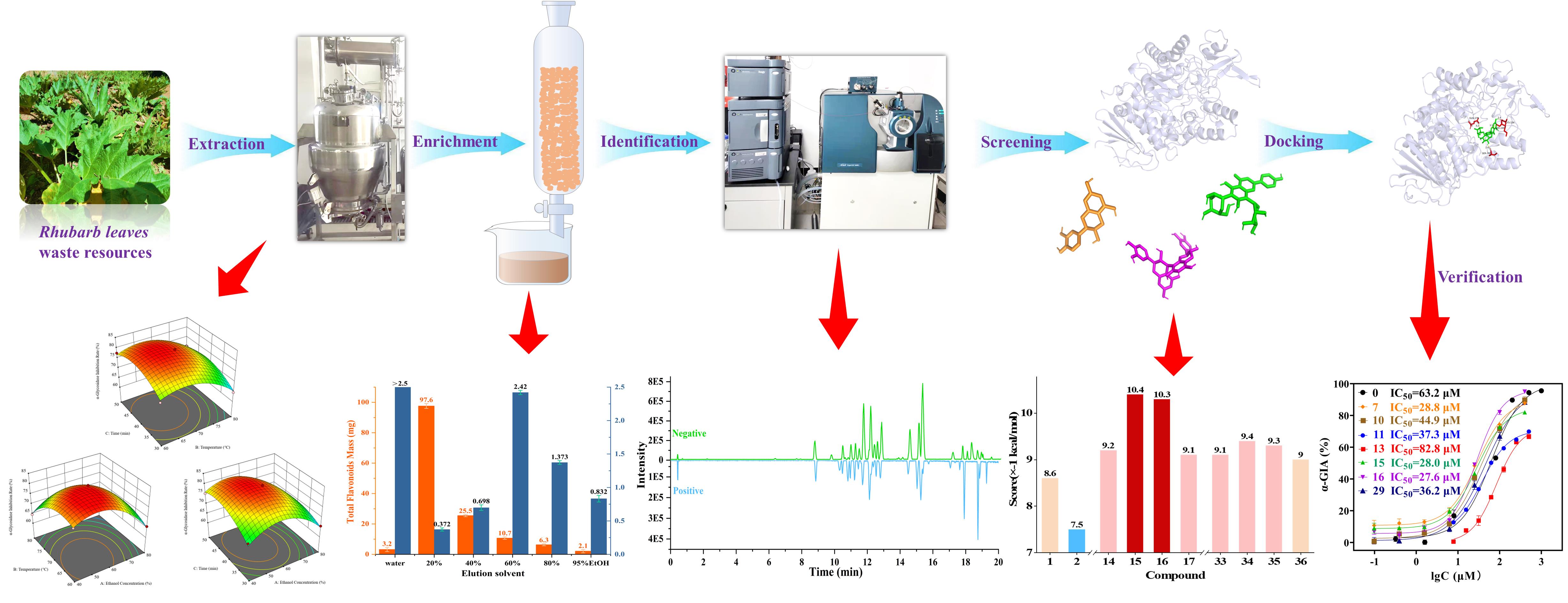 中國科學(xué)院西北高原生物研究所高原藏藥資源質(zhì)控與藥理毒理評價研究團隊以α-葡萄糖苷酶抑制活性作為關(guān)鍵評價指標(biāo),建立了基于大孔吸附樹脂富集、UPLC-QTOF-MS/MS分析表征、分子對接、體外驗證的唐古特大黃葉中α-葡萄糖苷酶抑制劑的系統(tǒng)篩選策略,篩選得到myricitrin、rumarin等6個α-葡萄糖苷酶抑制劑?;诜€(wěn)態(tài)、同步、三維熒光光譜和遠(yuǎn)紫外圓二色譜等多光譜技術(shù)的對接機制研究表明,6個抑制劑均能與α-葡萄糖苷酶發(fā)生結(jié)合并改變靶蛋白的酪氨酸和色氨酸殘基微環(huán)境,通過降低靶蛋白α-螺旋或β-轉(zhuǎn)角等二級結(jié)構(gòu)的含量從而導(dǎo)致蛋白酶失活,該研究為唐古特大黃廢棄資源的利用提供了新的見解。