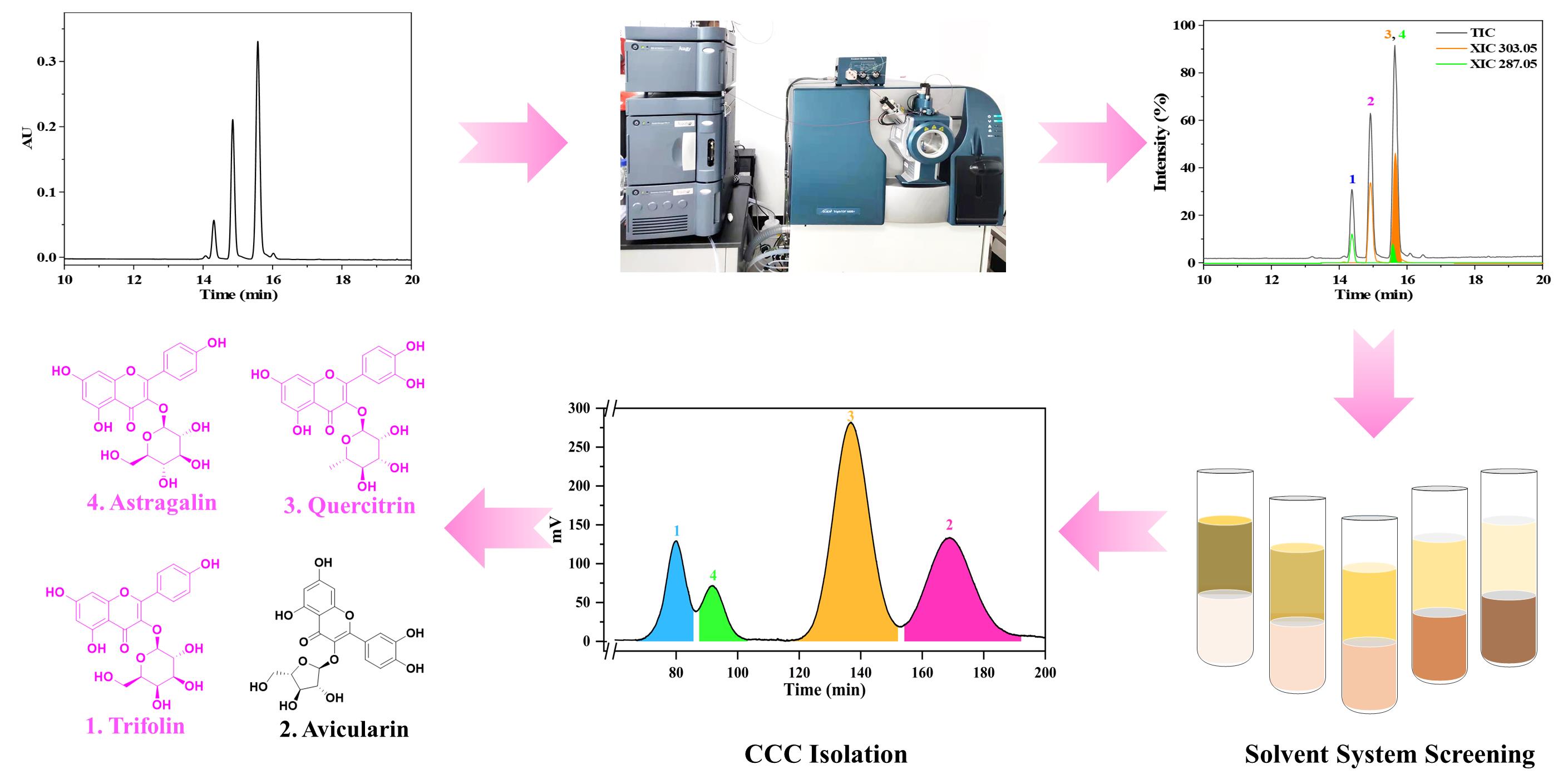 另外,由于天然產(chǎn)物組成成分和結(jié)構(gòu)復(fù)雜多樣,常常會出現(xiàn)色譜共洗脫現(xiàn)象,難以被發(fā)現(xiàn)、分析和分離。針對這一挑戰(zhàn),研究團隊提出一種基于UPLC-QTOF-MS/MS和CCC的HPLC共洗脫異構(gòu)體的差異識別和靶向分離策略。通過UPLC-QTOF-MS/MS實現(xiàn)了對共洗脫異構(gòu)體的差異特征精確識別和準(zhǔn)確定量,解決了共洗脫異構(gòu)體無法進(jìn)行CCC溶劑系統(tǒng)篩選的關(guān)鍵技術(shù)問題?;诖瞬呗?,成功從唐古特大黃葉中分離得到astragalin等四種高純度的黃酮類化合物,其中三個互為異構(gòu)體。該研究為天然產(chǎn)物分離過程中共洗脫異構(gòu)體的分析和分離提供了新的思路。
