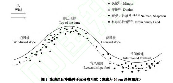 圖5??流動(dòng)沙丘沙蓬種子庫(kù)分布形式(虛線(xiàn)為 20 cm 沙埋深度)?