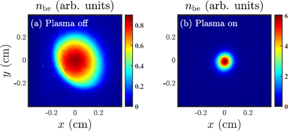 實驗中,基于高能電子成像實驗平臺,科研人員利用熱陰極微波電子槍產生的電子束及高壓直流放電等離子體靶,成功觀察到電子束在有源等離子體透鏡中的聚焦現(xiàn)象,同時對其聚焦原理深入分析。實驗結果表明(圖1):當?shù)入x子體靶不放電時,YAG屏上的束斑為1.25 mm,而該靶調節(jié)至合適的放電電壓和氣壓后,束斑減小至0.48mm,聚焦效果顯著!