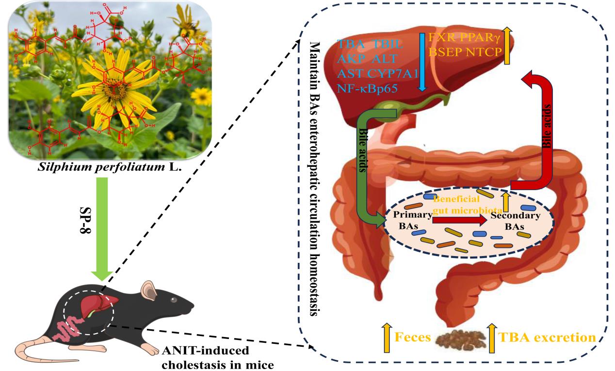 中國科學(xué)院西北高原生物研究所高原藥用資源生態(tài)保護(hù)與繁育研究團(tuán)隊從一種傳統(tǒng)藥材中篩選得到咖啡??鼘幩峄钚越M份,對CLD具有顯著的治療效果。該組份不僅能夠通過調(diào)控FXR信號通路,減少BAs的合成,而且能夠通過促進(jìn)BAs的肝腸循化,加速有害次級膽汁酸通過糞便排出體外,同時具有極強(qiáng)的抗炎活性,對膽汁淤積引起的肝臟損傷具有極強(qiáng)的保護(hù)和治療作用。該研究全面證實了咖啡??鼘幩峄钚越M份對膽汁淤積癥的治療效果并闡明了其作用機(jī)制,證實該組份具有很好的藥物開發(fā)潛力。