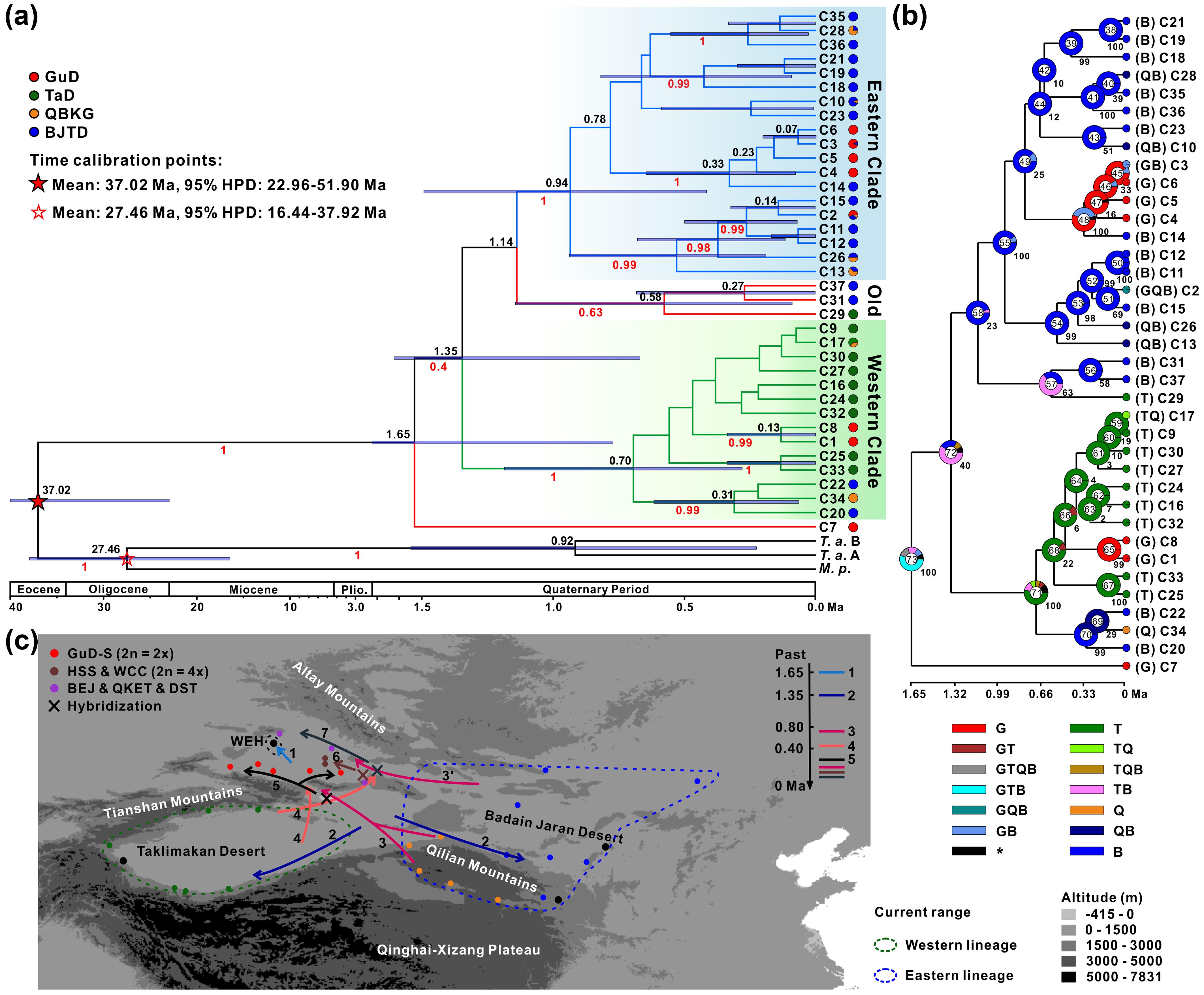 為了進(jìn)一步闡明紅砂不同支系的形成歷史,厘清雜交物種形成在北疆紅砂生物多樣性形成中的作用,中國科學(xué)院西北生態(tài)環(huán)境資源研究院馬小飛課題組采集了紅砂物種范圍的32個群體,通過分析并比對母系遺傳的cpDNA序列和雙親遺傳的nrITS序列在群體間的遺傳變異模式,重新深入解析了紅砂的譜系地理結(jié)構(gòu)及其時空演化歷史。