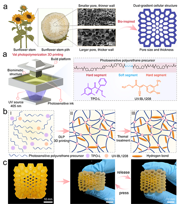 相關研究成果分別以“Multiple H-bonds Induced Mechanically Robust Vat Photopolymerization 3D Printing Poly(urethane-urea) Elastomers”和“Sunflower Pith Inspired Dual-Gradient Cellular Polyurethane Architecture with Amplified Mechanical Functions”為題發(fā)表在Materials Horizons(Materials Horizons,2024,https://doi.org/10.1039/D4MH01191K)和Chemical Engineering Journal(Chemical Engineering Journal,2024,500,156740)上。石河子大學聯(lián)培博士生楊星星和中國科學院大學博士生白常成分別為論文第一作者,蘭州化物所劉德勝助理研究員和王曉龍研究員為共同通訊作者。