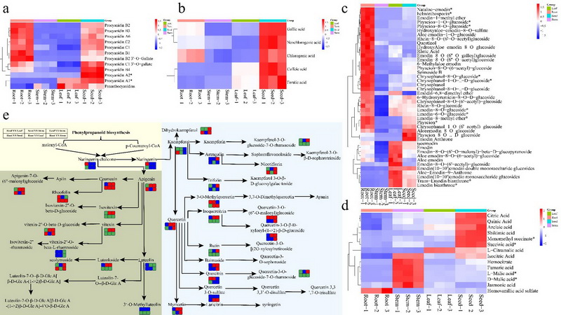 不同組織部分原花青素(a)、酚酸(b)、蒽醌(c)和有機(jī)酸(d)相對含量的熱圖及不同組織中黃酮醇生物合成途徑的一些關(guān)鍵代謝物的變化(e)
