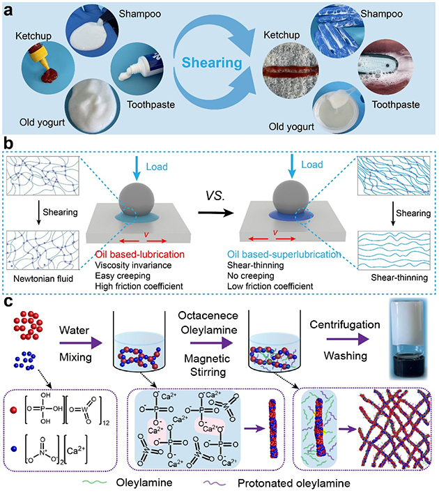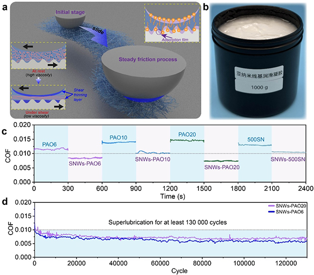 研究人員還利用剪切變稀的亞納米線材料的三維網(wǎng)絡(luò)結(jié)構(gòu),實(shí)現(xiàn)了多種基礎(chǔ)油的限域,發(fā)展了一系列半固態(tài)凝膠潤(rùn)滑劑(圖2),進(jìn)一步提高了多種基礎(chǔ)油的潤(rùn)滑性能,并在超過(guò)13萬(wàn)次摩擦周期內(nèi)保持穩(wěn)定,展現(xiàn)其長(zhǎng)期應(yīng)用的潛力。最為關(guān)鍵的是,通過(guò)在實(shí)驗(yàn)室中擴(kuò)大原料比例,可成功制備千克級(jí)產(chǎn)品,展現(xiàn)出其在工業(yè)應(yīng)用中的潛力。除此之外,基于亞納米線與PAO6潤(rùn)滑油復(fù)配制備的潤(rùn)滑劑還實(shí)現(xiàn)了鋼-鋼界面的減摩抗磨,極大提高了PAO6潤(rùn)滑油的潤(rùn)滑性能及承載性能。相關(guān)研究成果發(fā)表在ACS Nano(2024,DOI:10.1021/acsnano.4c12703)上,蘭州化物所博士生王劉程和張立強(qiáng)助理研究員為論文共同第一作者,王道愛(ài)研究員為通訊作者。