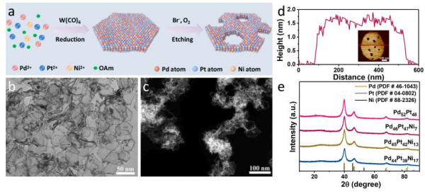 甲醇、乙醇等儲(chǔ)能小分子作為燃料的直接醇類(lèi)燃料電池,具有能量密度高、工作溫度低、環(huán)境友好、燃料儲(chǔ)存和填充方便等優(yōu)點(diǎn)。電催化劑作為電催化反應(yīng)的核心,對(duì)提高燃料電池的效率起著重要作用。然而,目前開(kāi)發(fā)的催化劑大多動(dòng)力學(xué)遲緩,并涉及多電子轉(zhuǎn)移過(guò)程的陽(yáng)極醇氧化反應(yīng)。以Pt和Pd為代表的鉑族金屬表現(xiàn)出良好的催化效果,但在提高其固有活性和穩(wěn)定性的同時(shí)還需要進(jìn)一步降低成本。多孔納米結(jié)構(gòu)可進(jìn)一步增加比表面積和孔體積,從而最大限度地提高反應(yīng)物分子的有效傳質(zhì)能力和納米級(jí)電催化劑內(nèi)的電子遷移率。因此,調(diào)控超薄鉑基或鈀基合金的孔隙,有望成為最大化本征催化活性和穩(wěn)定性的新途徑。