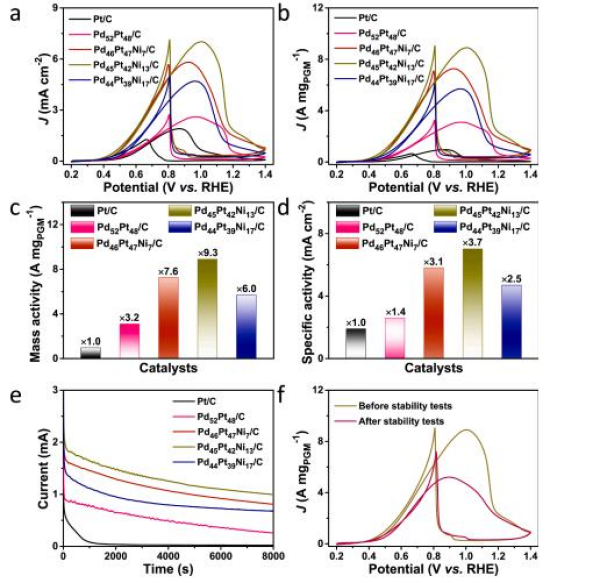 本研究創(chuàng)制了一系列具有可調(diào)成分的多孔PdPtNi納米片(圖1),在堿性電解質(zhì)中實(shí)現(xiàn)了對(duì)甲醇和乙醇氧化反應(yīng)的高效電催化。得益于超薄結(jié)構(gòu)、豐富的臺(tái)階原子和優(yōu)化的電子結(jié)構(gòu),優(yōu)化后的Pd45Pt42Ni13/C的MOR質(zhì)量活性和比活性分別達(dá)16.2 A mg PGM-1和12.7 mA cm-2,遠(yuǎn)高于商業(yè)Pt/C和其他PdPt基催化劑?。▓D2)。研究還證實(shí)了多孔PdPtNi納米片可作為高效的陽(yáng)極醇氧化反應(yīng)電催化劑,表明其在多電子轉(zhuǎn)移陽(yáng)極醇氧化反應(yīng)電催化中的多功能性。通過(guò)最大限度地增加電催化活性位點(diǎn)的數(shù)量和提高單個(gè)位點(diǎn)的內(nèi)在催化活性,通過(guò)在超薄Pt或Pd基納米結(jié)構(gòu)中引入孔隙,實(shí)現(xiàn)了陽(yáng)極醇氧化反應(yīng)電催化性能的顯著提升,為直接醇類(lèi)燃料電池提供了一類(lèi)高性能的陽(yáng)極催化劑。