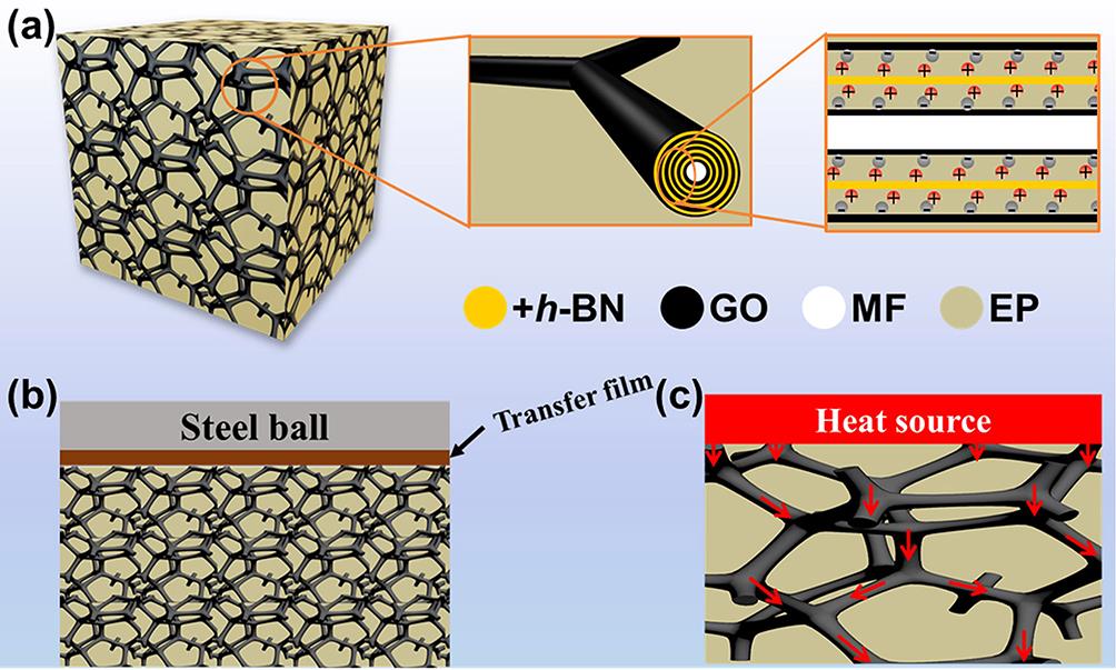 圖1.(a) GBS@polymer復(fù)合材料結(jié)構(gòu)示意圖。GBS@polymer復(fù)合材料(b)摩擦學(xué)和(c)熱傳導(dǎo)機(jī)理示意圖。
