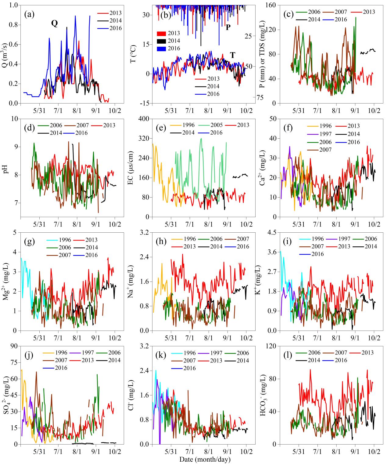 圖1. 烏魯木齊1號冰川流量、氣溫、降水、TDS、EC、pH和主離子的年際及年內(nèi)變化特征
