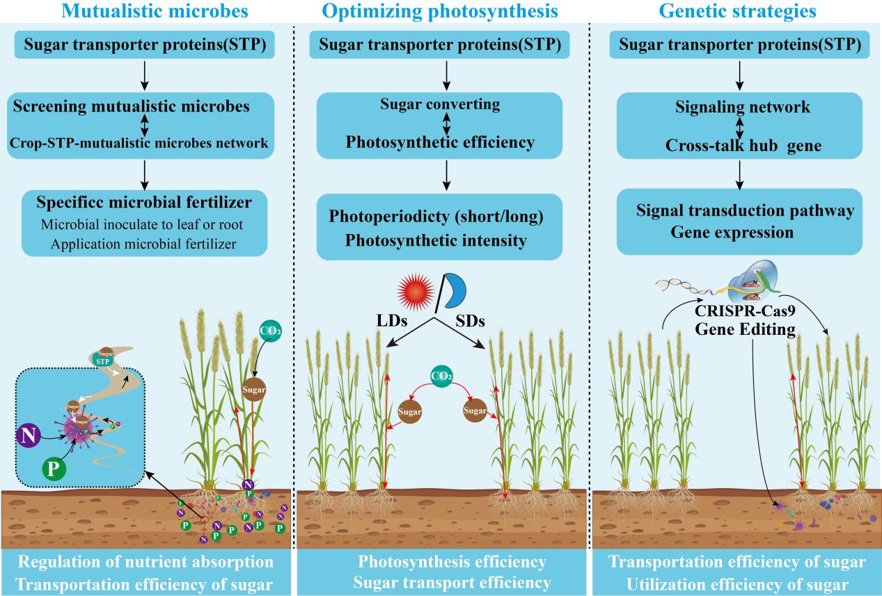 糖轉(zhuǎn)運(yùn)蛋白的主要作用是源庫(kù)運(yùn)輸與調(diào)控,影響植物生長(zhǎng)發(fā)育,響應(yīng)環(huán)境脅迫,與其他信號(hào)轉(zhuǎn)導(dǎo)通路的交互,介導(dǎo)植物-微生物的互作?;诖?,文章提出了通過(guò)糖轉(zhuǎn)運(yùn)蛋白提高作物產(chǎn)量的策略,增強(qiáng)糖轉(zhuǎn)運(yùn)蛋白與共生微生物的相互作用,提高作物對(duì)養(yǎng)分(如磷和氮)的吸收和運(yùn)輸效率,從而促進(jìn)作物生長(zhǎng),增加作物產(chǎn)量;建立光周期-糖轉(zhuǎn)運(yùn)蛋白模型,提高光合效率與資源分配,優(yōu)化光合作用,提高作物產(chǎn)量;借助 GWAS(全基因組關(guān)聯(lián)分析)和QTL(數(shù)量性狀位點(diǎn))定位技術(shù)及基因編輯(如 CRISPR-Cas9)相結(jié)合的技術(shù),通過(guò)遺傳策略改良作物,以達(dá)到增加作物產(chǎn)量的目的。該綜述文章為深入理解糖轉(zhuǎn)運(yùn)蛋白的作用機(jī)制提供了新思路,為提高作物產(chǎn)量提供了新的策略,對(duì)保障糧食安全具有重要參考價(jià)值和理論指導(dǎo)意義。
