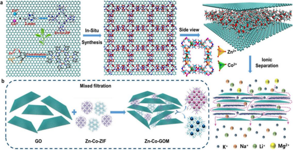 從鹽湖鹵水中獲取鋰資源是最重要的途徑之一。鹵水成分復(fù)雜,Mg2+和Li+水合離子半徑相似,鎂鋰分離難度大。膜分離技術(shù)具有節(jié)能、高效、環(huán)保、操作靈活和成本低等特點(diǎn),可通過精細(xì)調(diào)控膜的孔徑和表面化學(xué)性質(zhì),實(shí)現(xiàn)對特定離子的選擇性分離。但膜的穩(wěn)定性、耐腐蝕性以及長期使用后的性能衰退仍然是制約膜分離技術(shù)應(yīng)用的主要問題。針對上述問題,青海鹽湖所鹽湖有機(jī)質(zhì)與硼鉀分離技術(shù)課題組開發(fā)了一種新型的雙金屬有機(jī)框架(MOF)/氧化石墨烯(GO)復(fù)合膜,以提高鹽湖鋰的提取效率。