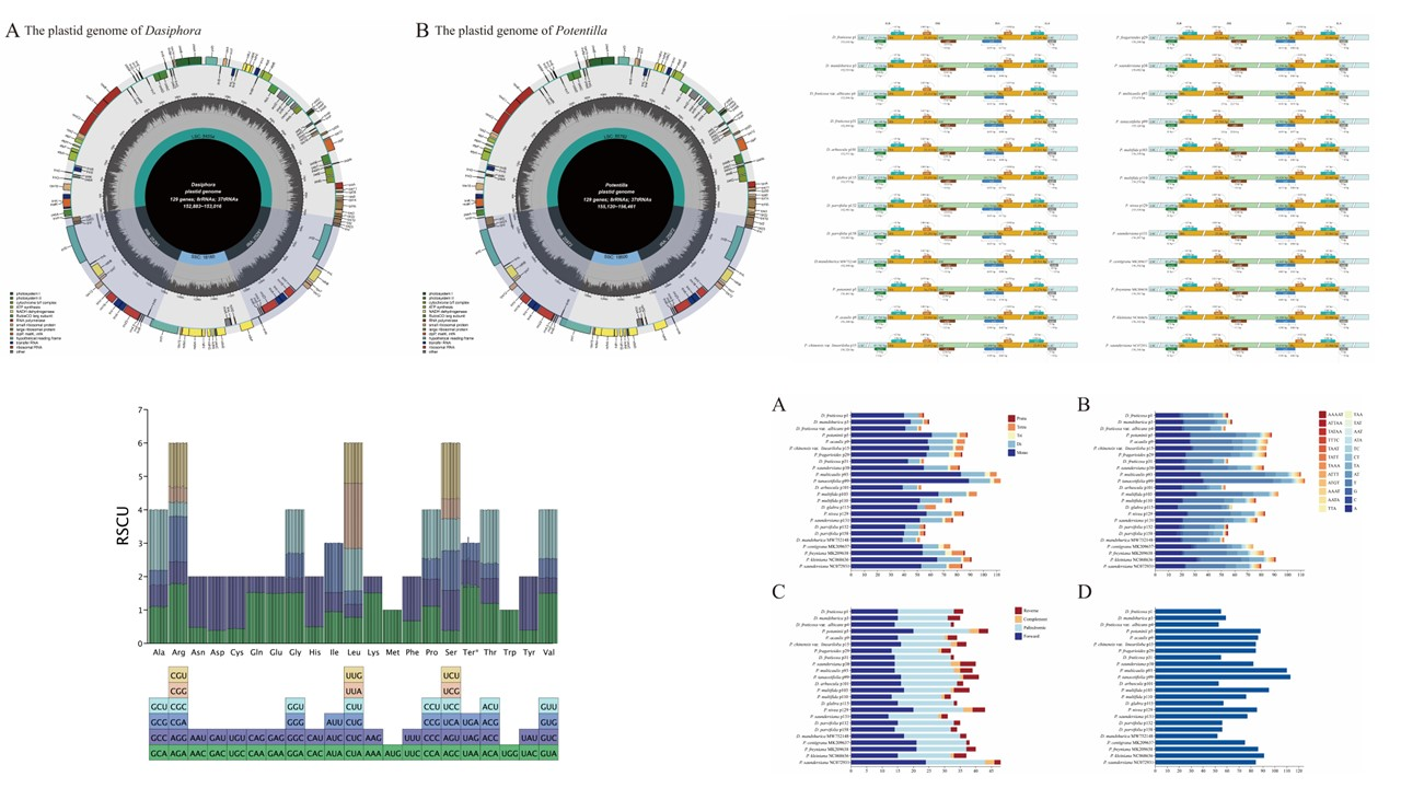 中國(guó)科學(xué)院西北高原生物研究所青藏高原植物適應(yīng)與進(jìn)化研究團(tuán)隊(duì)選擇了19個(gè)委陵菜屬和金露梅屬的全質(zhì)體基因組進(jìn)行Illumina二代測(cè)序,重建了該類群的系統(tǒng)發(fā)育關(guān)系,并研究了他們之間的核質(zhì)沖突關(guān)系。研究結(jié)果表明,這些質(zhì)體基因組的結(jié)構(gòu)、GC含量和基因組成都高度保守,包含84個(gè)CDS、37個(gè)tRNA基因和8個(gè)rRNA基因。此外,所有金露梅屬質(zhì)體基因組的rpl2失去了唯一的內(nèi)含子。比較基因組分析結(jié)果表明,質(zhì)體大小的差異歸因于LSC區(qū)、SSC區(qū)和IRS區(qū)的長(zhǎng)度差異,并且IR區(qū)大部分是保守的,非編碼區(qū)比編碼區(qū)具有更高的差異性。我們篩選了SSR,發(fā)現(xiàn)了7個(gè)高度可變位點(diǎn),可作為潛在的分子標(biāo)記,在闡明委陵菜屬和金露梅屬的屬間關(guān)系上具有一定的參考意義。通過核基因(ITS、ETS)和細(xì)胞質(zhì)基因(質(zhì)體、線粒體)構(gòu)建的系統(tǒng)發(fā)育樹,確定了委陵菜屬和金露梅屬的單系性。我們?cè)谖瓴藢僦袡z測(cè)到了核質(zhì)沖突,這種沖突往往會(huì)導(dǎo)致其單系性發(fā)生變化,我們推測(cè)可能在其進(jìn)化過程中發(fā)生了一定程度的種間雜交或不完整譜系分選事件。本研究通過對(duì)委陵菜屬和金露梅屬的系統(tǒng)發(fā)育比較分析,為該類群之間的分類學(xué)研究奠定基礎(chǔ)。
