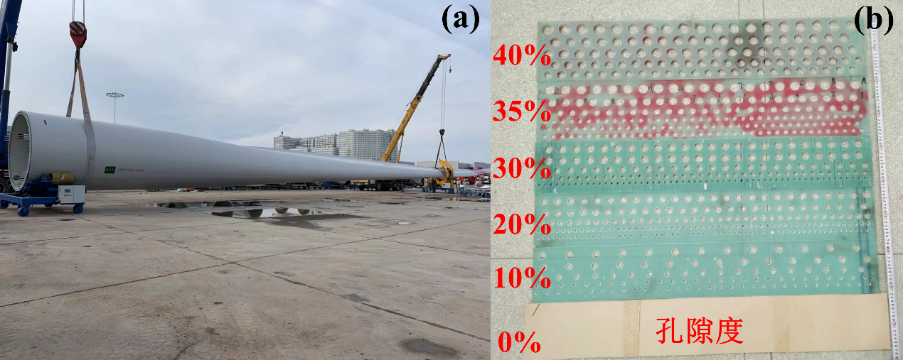 退役或損壞風(fēng)力發(fā)電機(jī)葉片(a)和不同孔隙度新型多孔沙障(b)