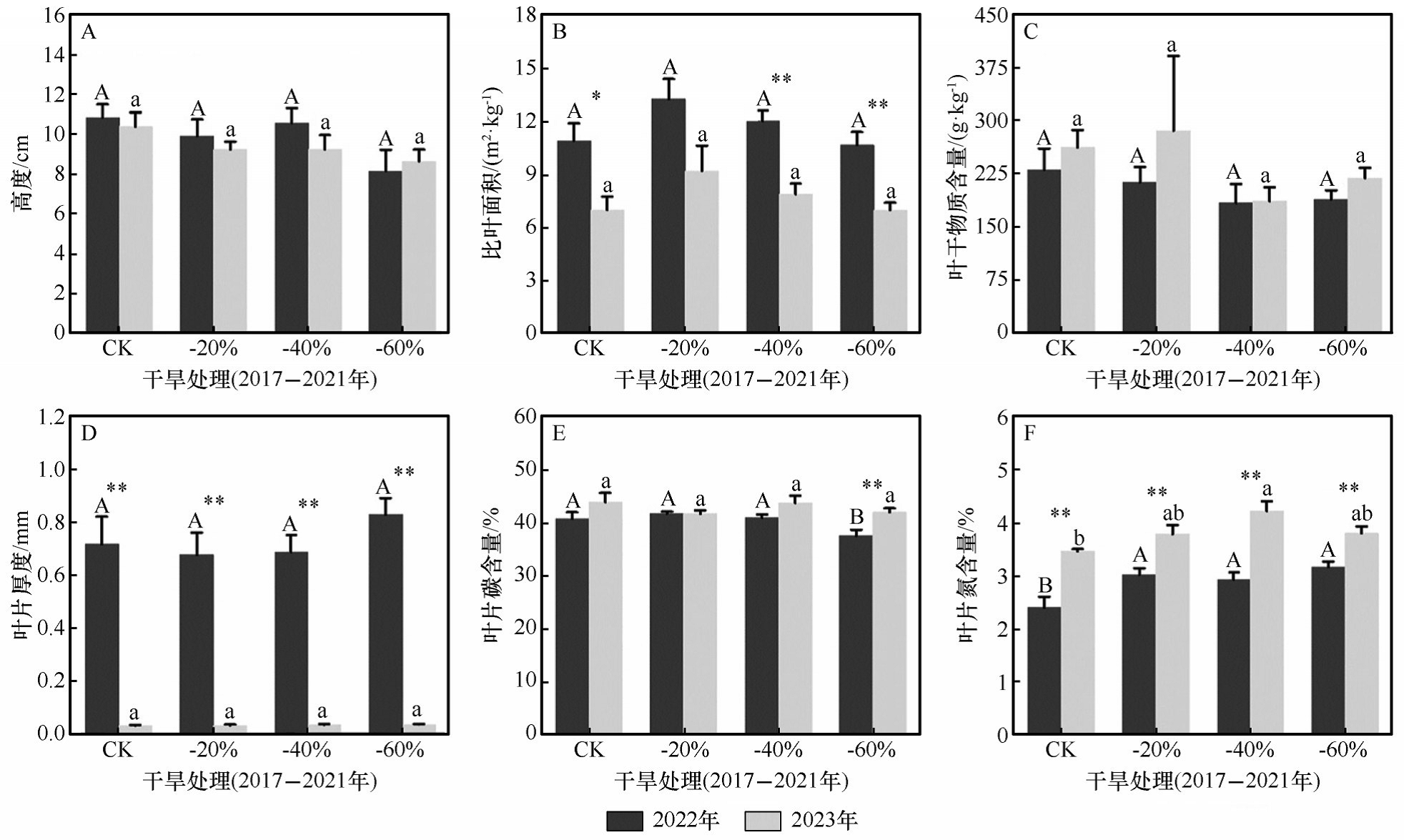 結(jié)果表明,干旱解除2年后,除減雨40%處理的物種豐富度顯著低于對(duì)照外,其他處理的物種豐富度以及所有處理下的密度、植物功能性狀、ANPP 均與對(duì)照無顯著差異,表明荒漠草原具有較強(qiáng)的恢復(fù)能力。在恢復(fù)期間,生長季降水對(duì)植被恢復(fù)影響顯著,恢復(fù)第1年(2022年)生長季降水量較高,減雨40%處理的葉片氮含量顯著高于對(duì)照,而所有處理的物種豐富度、密度、株高、比葉面積(SLA)、葉干物質(zhì)含量、葉片厚度(LT)和ANPP均與對(duì)照無顯著差異?;謴?fù)第2年(2023年)的生長季干旱使物種豐富度、密度、SLA、LT 和ANPP顯著低于第1年,葉片碳氮含量則相反。