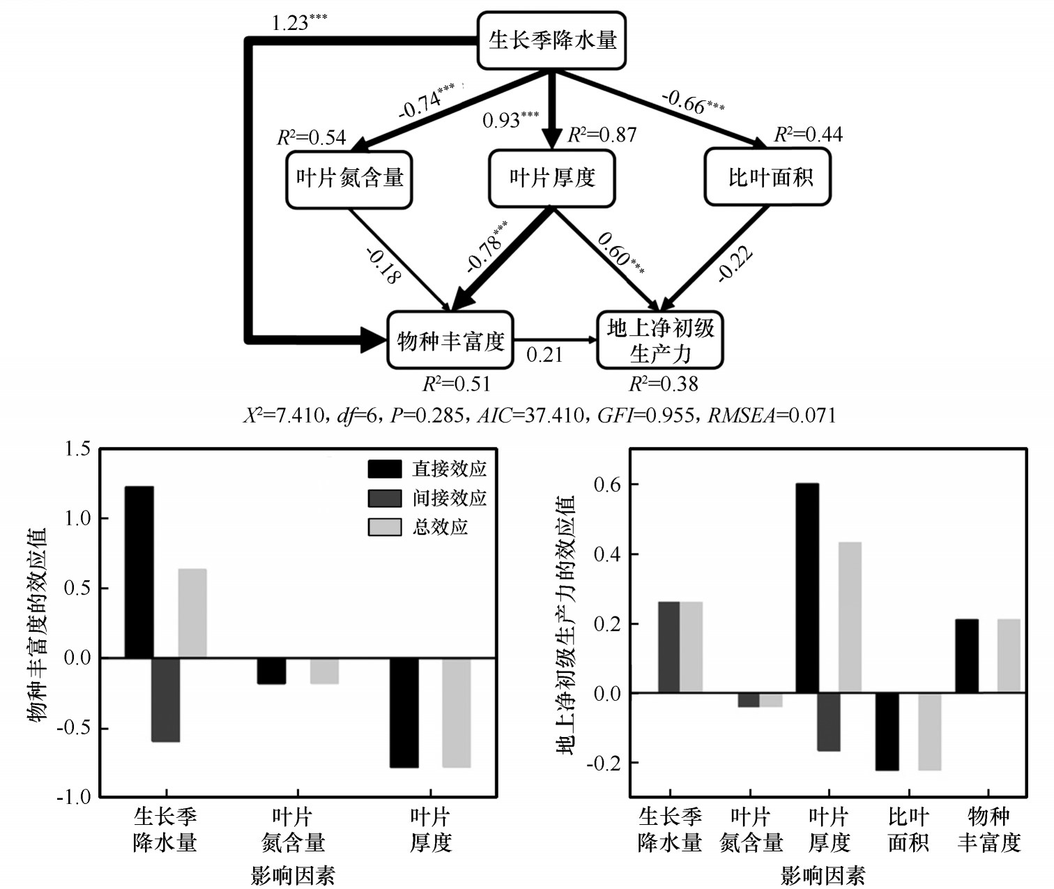 生長季降水對(duì)退化植被恢復(fù)過程中植物多樣性和生產(chǎn)力影響的結(jié)構(gòu)方程模型效應(yīng)值
