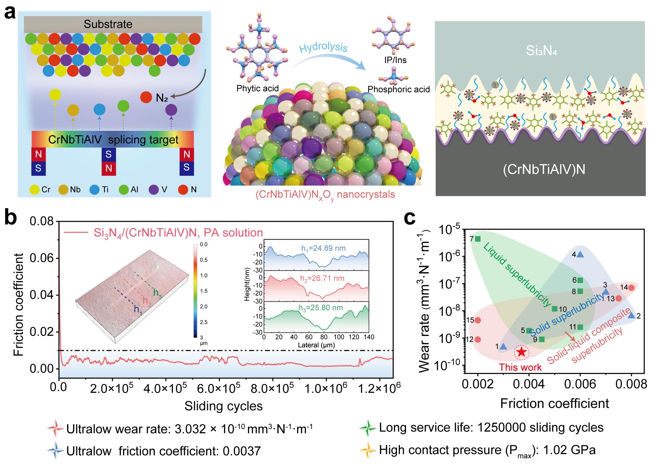 雖然水基超潤(rùn)滑材料具有諸多優(yōu)勢(shì),但其對(duì)金屬摩擦副的腐蝕問(wèn)題會(huì)影響超潤(rùn)滑狀態(tài)的長(zhǎng)期穩(wěn)定性。為此,中國(guó)科學(xué)院蘭州化學(xué)物理研究所潤(rùn)滑材料全國(guó)實(shí)驗(yàn)室研究團(tuán)隊(duì)近期提出了一種基于摩擦催化效應(yīng)的“固-液復(fù)合超潤(rùn)滑”策略,基于天然有機(jī)酸植酸和高熵陶瓷涂層的協(xié)同作用實(shí)現(xiàn)了優(yōu)異的減摩抗磨性能,有效地避免了水基潤(rùn)滑劑的腐蝕問(wèn)題。通過(guò)磁控濺射技術(shù)在軸承鋼表面沉積了(CrNbTiAlV)N高熵陶瓷薄膜(圖1),表現(xiàn)出優(yōu)異的力學(xué)性能并提供了豐富的反應(yīng)位點(diǎn)。此外,在摩擦過(guò)程中高熵陶瓷表面還形成了一層鈍化層,可有效防止水基潤(rùn)滑劑對(duì)鋼基體的腐蝕。