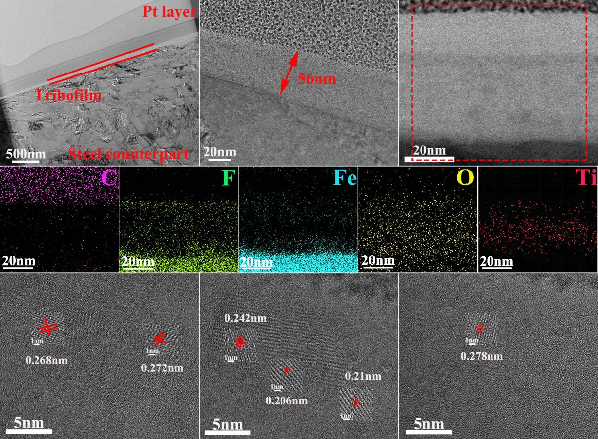 近期,針對纖維織物自潤滑復(fù)合材料摩擦學(xué)性能協(xié)同優(yōu)化的技術(shù)難題,研究團隊基于前期研究基礎(chǔ),制備了具有核殼結(jié)構(gòu)的Ti3C2/SA/TiO2-MePCM相變微膠囊。該微膠囊以機械強度優(yōu)異的二氧化鈦為殼層增強復(fù)合材料力學(xué)性能,內(nèi)核正二十二烷通過相變作用吸收摩擦熱并實現(xiàn)局部固-液協(xié)同潤滑,同時二維材料Ti3C2Tx憑借其層間滑移特性和高承載能力有效降低復(fù)合材料的摩擦損傷。實驗數(shù)據(jù)表明,引入該微膠囊后纖維織物自潤滑復(fù)合材料的摩擦系數(shù)由0.053降至0.046,磨損率由8.9×10-14m3 (N·m)-1顯著降低至3.5×10-14m3(N·m)-1。研究團隊通過多種表征技術(shù)系統(tǒng)解析了摩擦膜的微觀形貌演變規(guī)律,闡明了織物復(fù)合材料的減摩抗磨作用機制,為核殼結(jié)構(gòu)材料在摩擦學(xué)領(lǐng)域的創(chuàng)新應(yīng)用提供了理論支撐。