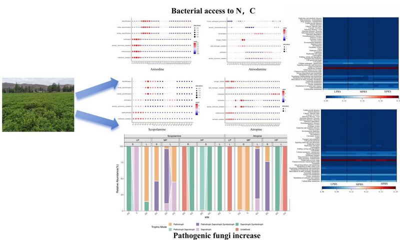 中國科學(xué)院西北高原生物研究所高原藥用資源生態(tài)保護(hù)與繁育研究團(tuán)隊(duì)以山莨菪為研究對象,基于微生物組和不同磷肥添加水平下生物堿含量的靶向測定,分析了磷肥添加對山莨菪生物堿含量的影響,揭示了土壤-微生物-植物相互作用的新機(jī)制。研究表明:磷肥通過雙重途徑對生物堿含量產(chǎn)生影響。一方面,土壤氮磷比例失調(diào)打破了土壤微生物氮循環(huán)的平衡,促使更多的細(xì)菌通過硝化-反硝化等過程獲得氮源和碳源,體現(xiàn)了磷肥添加下生物堿合成所需的氮源和能量的缺乏,干擾了植物次生代謝的資源分配;另一方面,磷肥添加重構(gòu)了微生物群落的功能布局,表現(xiàn)為低磷環(huán)境下菌根共生系統(tǒng)對碳、氮、磷的協(xié)同代謝增強(qiáng),而高磷環(huán)境下病原真菌大量繁殖阻礙了生物堿在植物體內(nèi)的合成和積累。這種微生物功能群落的生態(tài)位分化表明土壤養(yǎng)分?jǐn)_動會改變微生物代謝網(wǎng)絡(luò),進(jìn)而調(diào)控藥用植物的次生代謝,為分析人工栽培中土壤管理、微生物功能和藥材質(zhì)量之間的耦合關(guān)系提供了理論依據(jù),明確了養(yǎng)分-微生物-代謝的級聯(lián)調(diào)控效應(yīng),為山莨菪的高效利用和價值提升提供了新見解。未來的研究應(yīng)重點(diǎn)關(guān)注基于微生物功能調(diào)控的精準(zhǔn)施肥策略,以實(shí)現(xiàn)藥用植物栽培中產(chǎn)量和品質(zhì)的協(xié)同提升。