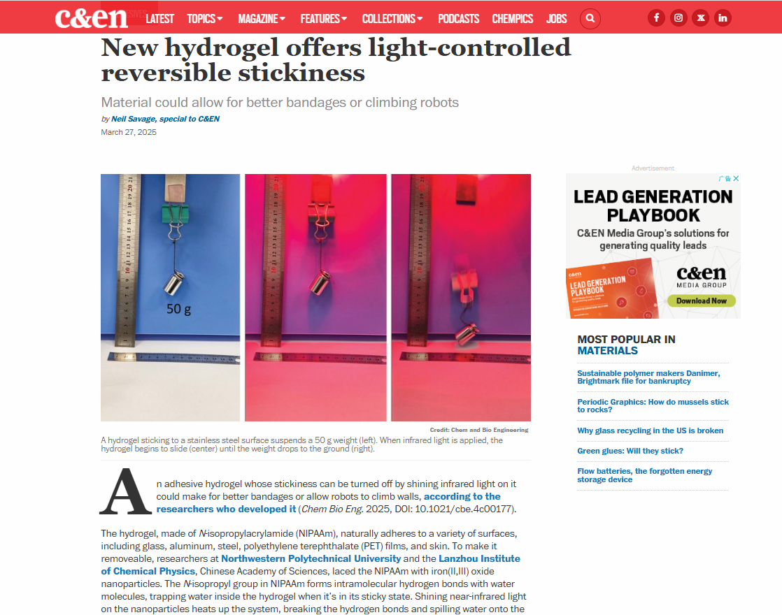相關(guān)研究成果以“Light-controlled Adhesive Hydrogels for On-Demand Adhesion”為題發(fā)表在Chem & Bio Engineering上。同時(shí),該成果已被美國(guó)化學(xué)學(xué)會(huì)發(fā)行的新聞周刊chemical?&?engineering?news(C&EN,全球最具權(quán)威和影響力的化學(xué)新聞來(lái)源之一。)以“New?hydrogel?offers?light-controlled?reversible?stickiness”為題報(bào)道。