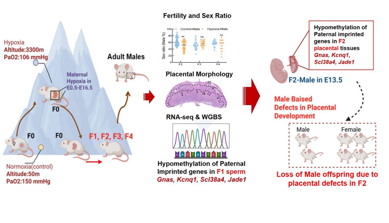 為探究母體低氧環(huán)境暴露對子代的跨代影響,中國科學(xué)院西北高原生物研究所動(dòng)物生態(tài)與資源保護(hù)研究團(tuán)隊(duì)建立了孕期低氧暴露小鼠模型,將經(jīng)歷過孕期低氧暴露的小鼠(F0)轉(zhuǎn)運(yùn)至低海拔后,出生的雄性小鼠和對照雌鼠合籠,連續(xù)飼養(yǎng)四代(F1-F4)。從2018年 9月到 2023年 8月,通過大量出生性別統(tǒng)計(jì)和不同發(fā)育階段的性別鑒定,發(fā)現(xiàn)母體孕期低氧暴露會(huì)造成F2代雄性個(gè)體顯著減少。進(jìn)一步的分析發(fā)現(xiàn)F2雄性減少是由于在胚胎期13.5天發(fā)生的胚胎特異性丟失。雄性胚胎丟失的主要原因?yàn)樘ケP形態(tài)和功能異常。研究團(tuán)隊(duì)通過胎盤轉(zhuǎn)錄組和全基因組DNA甲基化測序聯(lián)合分析,發(fā)現(xiàn)父源印記基因Slc38a4,Gnas,Jade1 和Kcnq1表達(dá)異常。隨后,通過對F1代小鼠成熟精子與F2代雄性胎盤全基因組DNA甲基化進(jìn)行聯(lián)合分析,結(jié)果發(fā)現(xiàn)以上印記基因DNA甲基化模式高度相似。這說明經(jīng)歷胚胎期低氧的F1代雄性小鼠的精子存在甲基化異常,并且可以進(jìn)一步影響F2雄性個(gè)體生長發(fā)育進(jìn)而導(dǎo)致性別比例異常。該工作系統(tǒng)地揭示母體低氧暴露對F1及F2代發(fā)育影響的跨代遺傳機(jī)制,為深入理解高原低氧暴露的生殖和健康風(fēng)險(xiǎn)提供了新的表型數(shù)據(jù)。