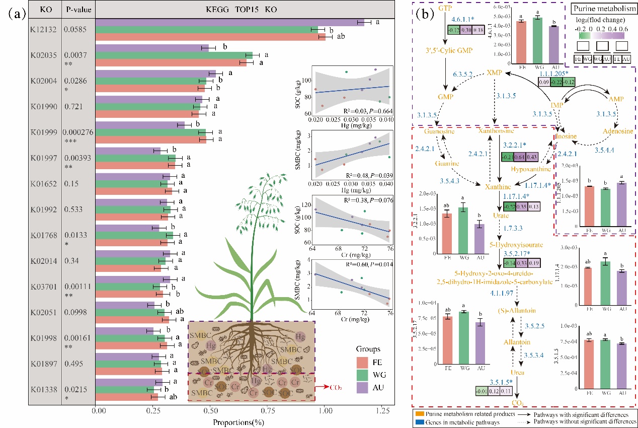 針對(duì)這一問(wèn)題,中國(guó)科學(xué)院西北高原生物研究所三江源草原生態(tài)系統(tǒng)國(guó)家觀測(cè)研究站團(tuán)隊(duì)在青藏高原祁連山南麓選擇了圍封(FE)、冬季放牧(WG)和開(kāi)墾(AU)3種不同干擾的草地管理措施為研究對(duì)象,探明了微生物群落結(jié)構(gòu)和功能如何響應(yīng)因草地管理引起的植被群落和PTEs的變化,以及對(duì)它們的調(diào)控路徑。研究結(jié)果表明,草地管理措施改變了地上禾本科和豆科植被群落的結(jié)構(gòu)及地下生物量的分配,導(dǎo)致K的分布變化,進(jìn)而引起真菌群落結(jié)構(gòu)和氮代謝酶的顯著變化。Cr和Hg與微生物相互作用影響SOC和SMBC的代謝過(guò)程,可能對(duì)高寒草甸固碳具有一定積極作用,并且高寒草甸對(duì)PTEs具有良好的抗性。適度干擾的冬季放牧(WG)有利于維持高寒草地微生物群落結(jié)構(gòu)和功能的穩(wěn)定性。本研究為青藏高原祁連山高寒草甸的改善提供科學(xué)依據(jù)。