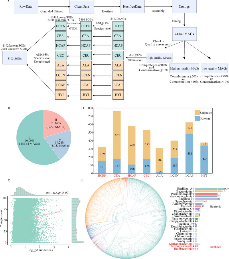 研究采集了青藏高原地區(qū)多種鹿科動物的糞便樣本,并結(jié)合公共數(shù)據(jù)庫中平原地區(qū)鹿科動物樣本進行分析,通過宏基因組組裝共獲得了41,847個宏基因組組裝基因組(MAGs),并構(gòu)建了3,193個高質(zhì)量物種水平基因組,建立了目前最為系統(tǒng)、全面的鹿科動物腸道微生物組數(shù)據(jù)庫。這是國內(nèi)外首個基于多物種、大規(guī)模宏基因組分析的鹿科動物腸道微生物資源庫,為后續(xù)功能挖掘、微生物資源利用及瀕危物種保護提供了堅實的數(shù)據(jù)基礎(chǔ)。
