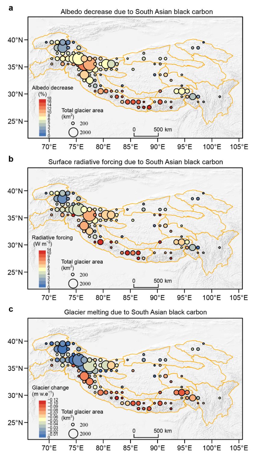 近日,中國科學院西北生態(tài)環(huán)境資源研究院康世昌研究員課題組,聯(lián)合清華大學陳德亮教授、美國猶他州立大學猶他州氣候中心Robert教授,發(fā)現(xiàn)南亞黑碳氣溶膠通過增加消融和減少冰川物質(zhì)補給,加速了以冰川退縮為主的青藏高原固體水儲量損失,尤其在喜馬拉雅地區(qū)及其孕育的印度河、恒河-布拉馬普特拉河流域最為顯著。