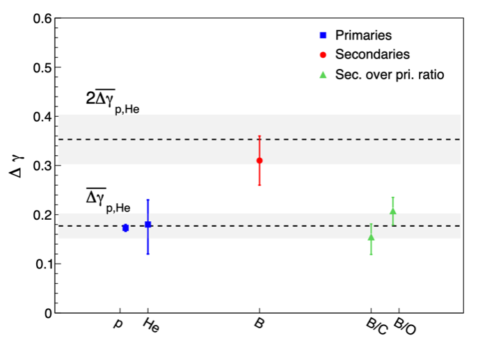 圖3:“悟空”號(hào)觀測(cè)到的硼元素譜指數(shù)變硬程度(?γ)約為初級(jí)宇宙線質(zhì)子和氦核的兩倍