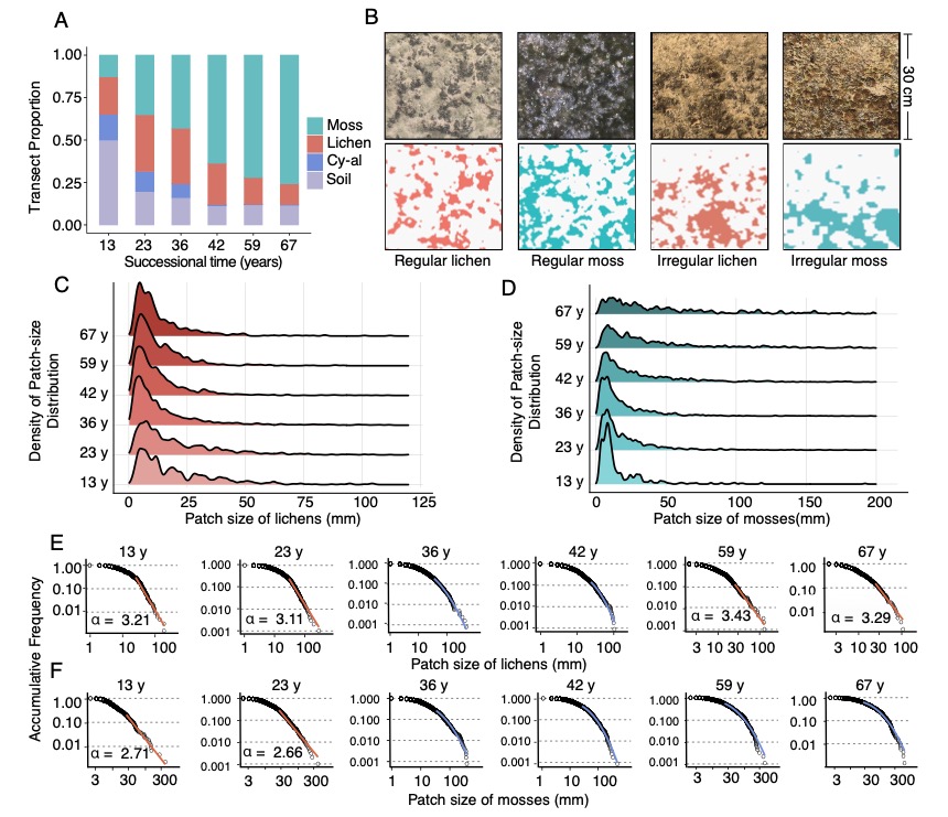 研究團(tuán)隊(duì)采用了計(jì)算建模與全局-局部耦合的野外調(diào)查相結(jié)合的研究方法。理論建?;诟怕实脑詣?dòng)機(jī)(Cellular automaton)模型的開發(fā),模擬了地衣和蘚類斑塊的動(dòng)態(tài)變化。野外觀測(cè)在中國(guó)科學(xué)院沙坡頭沙漠試驗(yàn)研究站進(jìn)行,通過在不同演替階段的人工固沙植被帶中設(shè)置樣線,記錄了生物結(jié)皮的覆蓋度、組成和斑塊大小分布。研究通過對(duì)冪律分布的擬合,從全局尺度檢測(cè)主導(dǎo)生物結(jié)皮動(dòng)態(tài)的反饋模式。通過不同演替階段和不同斑塊大小下生物結(jié)皮斑塊中心與邊緣之間的生長(zhǎng)差異比較,從斑塊尺度驗(yàn)證局部自組織過程,對(duì)比模擬結(jié)果揭示了生物結(jié)皮自組織機(jī)理及其生態(tài)意義。