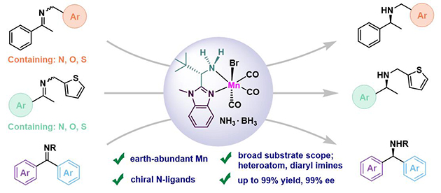 近日,中國科學院蘭州化學物理研究所低碳催化與二氧化碳利用全國重點實驗室仿生催化與低碳化學組,在前期發(fā)展的錳催化不對稱轉移氫化反應的基礎上 (ACS Catal.,2021,11,8033-8041;J. Catal.,2022,413,487-497;J. Catal.,2024,438,115680),在含雜原子(N,O,S)亞胺和雙芳基亞胺的不對稱轉移氫化反應取得了新進展。