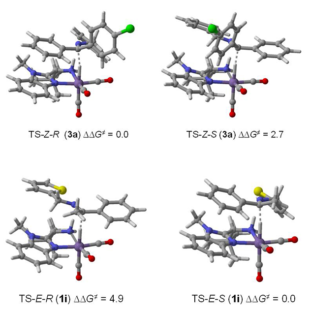 圖2.含雜原子亞胺和雙芳基亞胺的不對稱氫轉移過程的過渡態(tài)模型