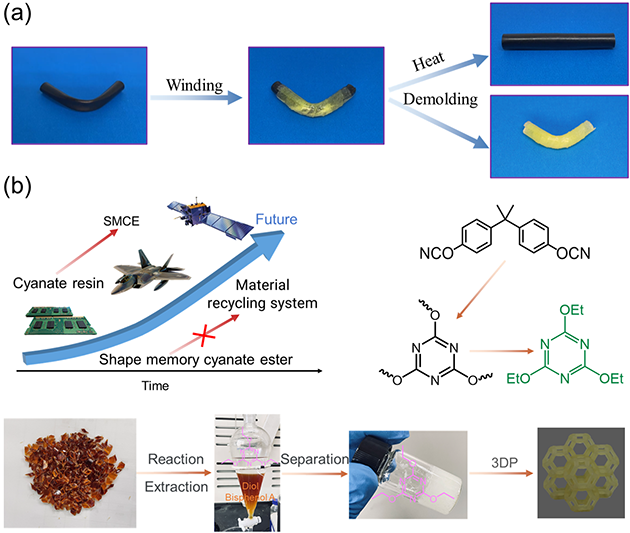 為探索SMCE的應(yīng)用潛力,研究人員依托酯鍵與三嗪環(huán)的動(dòng)態(tài)協(xié)同交換特性,構(gòu)建了SMCE智能模具(ACS Appl. Mater. Interfaces. 15(20) (2023) 24968-24977)。該模具不僅可實(shí)現(xiàn)光固化和室溫固化材料的精準(zhǔn)成型,更能在自身轉(zhuǎn)變溫度以上適配高溫固化材料的成型需求,有效降低了溫度對(duì)模具服役穩(wěn)定性的制約。針對(duì)SMCE及模具損壞后可能造成的環(huán)境污染與資源浪費(fèi)問(wèn)題,通過(guò)三嗪環(huán)的親核芳香取代反應(yīng)實(shí)現(xiàn)了熱固性SMCE的閉環(huán)回收(ACS Appl. Polym. Mater. 6(24) (2024) 15313-15322)?;厥盏闹鳟a(chǎn)物三乙基三嗪可被應(yīng)用于3/4D打印,以及形狀記憶氰酸酯彈性體的合成,為構(gòu)建SMCE材料循環(huán)體系提供了關(guān)鍵的技術(shù)支撐。