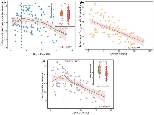 研究發(fā)現(xiàn),隨著礫石覆蓋度的增加,草地植物物種豐富度、功能群組成及生物量顯著下降,尤其是地下生物量的減少最為明顯;土壤含水量、孔隙度及養(yǎng)分含量顯著降低,而容重顯著升高,導致生態(tài)系統(tǒng)整體功能衰退。礫石化不僅直接抑制植物生長,還通過削弱土壤養(yǎng)分供給間接降低生態(tài)系統(tǒng)多功能性。隨機森林與結構方程模型分析進一步揭示,土壤養(yǎng)分和植物多樣性是決定生態(tài)系統(tǒng)多功能性的關鍵調控因子。隨礫石化程度加劇,地上功能指數(AEMF)和地下功能指數(BEMF)均顯著下降,后者的響應更為敏感,當礫石覆蓋度超過22%時,生態(tài)系統(tǒng)多功能性(EMF)出現(xiàn)明顯突變性下降,表明該閾值可作為高寒草地退化的早期預警指標。研究指出,高寒草地礫石化退化過程會破壞植物-土壤耦合關系,導致生態(tài)功能的同步退化。