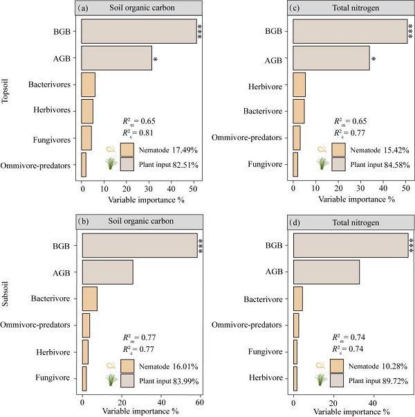 圖3?植物輸入與線蟲營養(yǎng)組對土壤養(yǎng)分變化的相對重要性