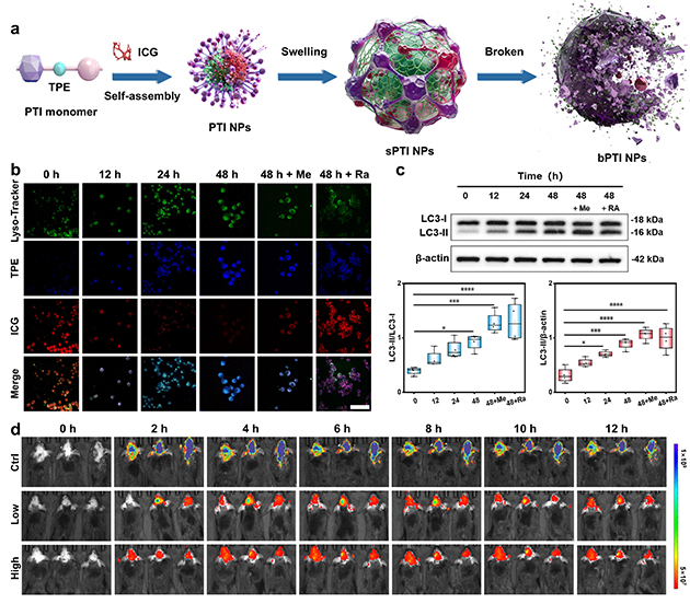 團隊進一步探索溶酶體功能變化與Aβ蛋白相分離之間的關系。通過ATRP合成pH響應骨架,將AIE染料四苯乙烯(TPE)共價接枝,并自組裝包載近紅外ACQ染料吲哚菁綠(ICG),形成AIE/ACQ協(xié)同的比率成像納米結構探針(PTI),實現AD自噬溶酶體酸化缺陷及其驅動的相分離過程的可視化“全流程”監(jiān)測。